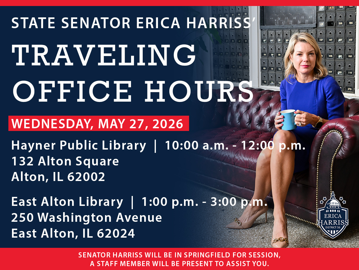 State Senator Erica Harriss invites residents to stop by during Traveling Office Hours to receive assistance with state services, ask questions, and share feedback on state issues and legislation.